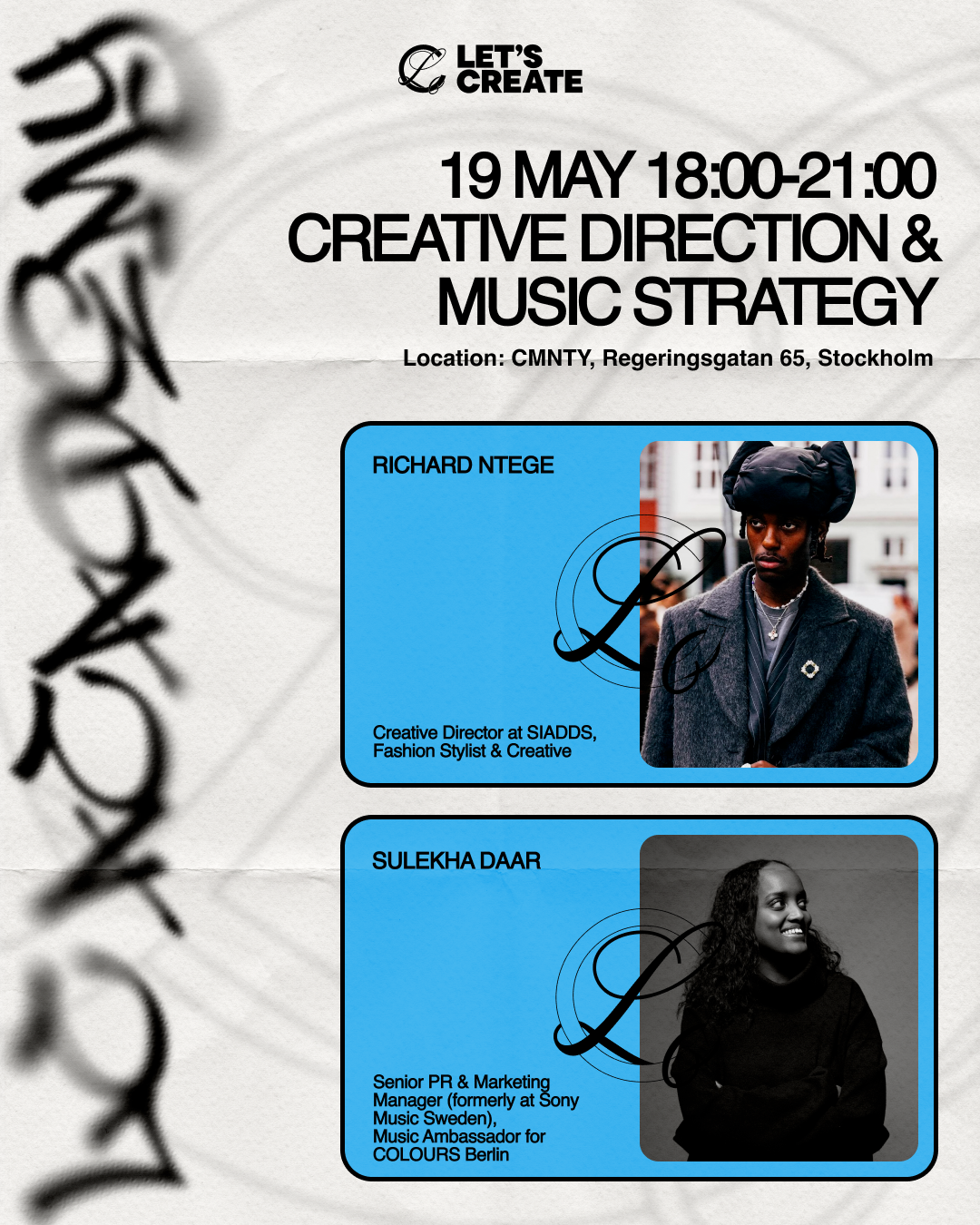 You’ll hear from Richard Ntege, Creative Director at SIADDS and a boundary-pushing stylist and visual creative, and Sulekha Daar, senior PR & marketing manager (formerly at Sony Music Sweden) and music ambassador for ColorsxStudios in Berlin.